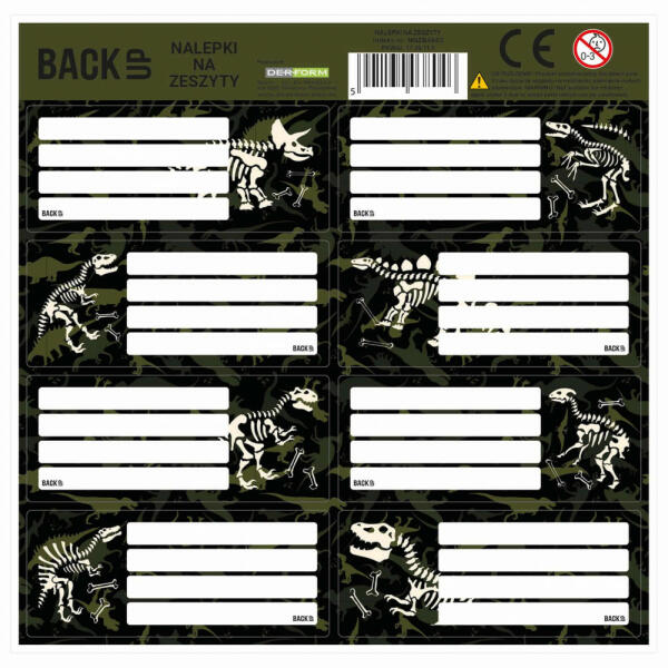 DERFORM Dinoszaurusz füzetcímke 8 db/ív, többféle, fekete, BackUp, 2022 (DFM-NNZB4A113)