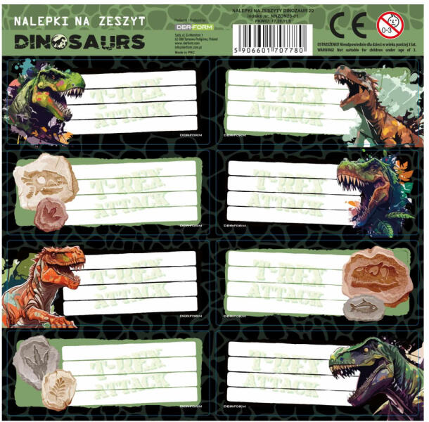 DERFORM Dinoszaurusz füzetcímke 8 db/ív, dínók és kövek, többféle (NNZDN20) (DFM-NNZDN20)