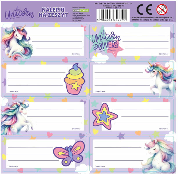 DERFORM Unikornis füzetcímke 8 db/ív, többféle (NNZJR16) (DFM-NNZJR16)